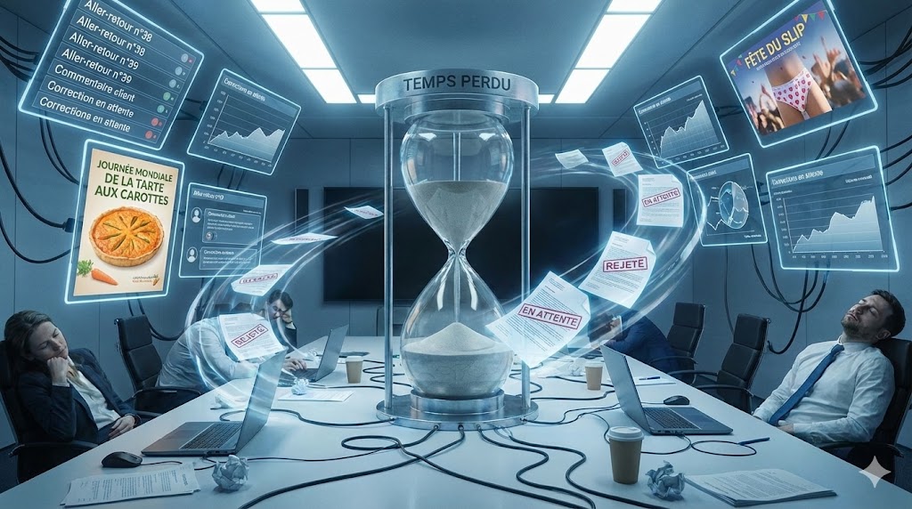 Parce qu’il faut publier 2x par semaine, le prestataire (payé mensuellement) devient créatif. Cette année, vous avez fêté la journée mondiale de la tarte aux carottes et les 80 ans du forum de la pâquerette de nouvelle Zélande. En attendant, vous passez 5h par semaine à relire des trucs moyens et vous avez abandonné l’idée d’avoir des réseaux vraiment cools.