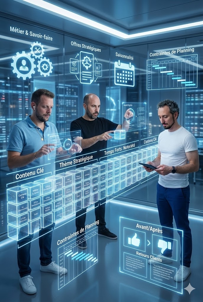 Rien à préparer. On récolte tout dans les ateliers (contexte, produits, saisonnalité, preuves) puis on tourne et shoote lors du Content Day chez vous. Comptez une demi-journée par semaine pendant 4 semaines pour que tout soit prêt en 30 jours. On vous guide pas à pas ; vous validez, on produit.