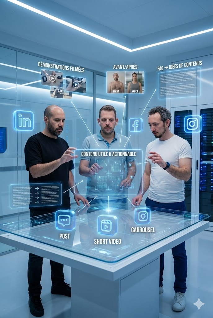 Pour chaque sujet, on choisit le bon format (post, vidéo courte, carrousel) et le bon canal (LinkedIn B2B / Facebook-Instagram B2C). Clair, utile, orienté action.